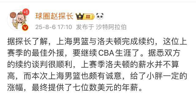 据媒体人《球圈赵探长》透露,上海男篮已经与洛夫顿完成了续约,球队为他提供了一份涨薪续约,金额达到了7位数美元。在休赛期,洛夫顿代表nba球队参加了夏季联赛,发挥的中规中矩,并没有得到一份正式合同,他很难回到nba打球。选择和上海男篮续约,是双向奔赴,他可以保证球队至少能够进入季后赛,第二年的cba生涯,有望更进一步。